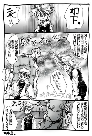 ロキとオーディン2−2誕生日の落書きをしながら、考えていた話。 北欧神話では男神が女性に変身したときに やっちゃうだけじゃなくて、妊娠してこども産めるという…… ロキが半ばオーディンに裏切られて(笑) スレイプニールを産んでしまう話が、自分的には かなり光流と忍の掛け合いっぽいのです! (何かこう書くと知らない人には、えらい誤解を受けそうな話ですが ↑の書き方は物語のメインの部分ではないので) この話のロキが光流ぽーい。 とはしゃいでいたら 「ロキ(光流)がこども産んで帰ってきたら オーディン(忍)は切ないだろうねぇ……」 としみじみ言われてしまったので そんなものか。 と思った感じもついでに込めてみました。 これは果たしてグリーンウッド何だろうかと 相変わらず疑問に思いながら(笑) ゆや/<070404> |