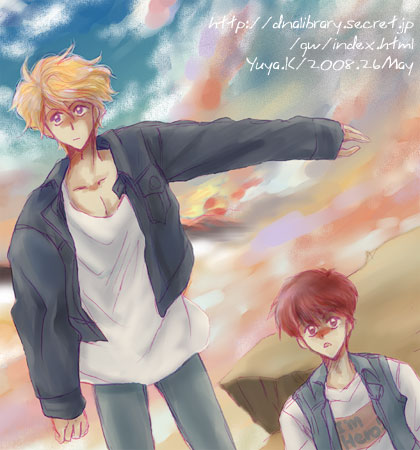 光流とすかちゃんCG;Saiメイン+加工Pォトショ7かな? すかみつというより、単に並んでる構図なだけだけど。 分類的にはそこに入れてしまう。 なんかいつもこんな構図を書いている気がする…… 特に光流。 風と光流って合わせるのが好きなんです。 多分これ、原作のイラストの影響なんだと思うんですが 光流が指差していて、まわりに三人がいるっていうイラストがあるじゃないですか あれ、なんかこう……考えてみると暗示的な絵だなみたいなことを 考えたときがあって なんかそういうイメージ。 当初、光流を書いてから、本当は忍を書くつもりだったんだけど 忍を書くスペースがなくて もう一人は座らせて入れようと思ったら 自分の中で、こういう絵のときに 忍と光流同じ方向を向かせられなくて すかちゃんに変更してしまいました。 すかちゃんは、光流と同じ方向を向くんです。 Saiの練習。まだまだ続く。 塗るところだけを塗ってから、フォトショップで仕上げたほうが やっぱりきれいかなあ…… ちょっと細かいところが、絵が荒くなってしまった気がする。 でも、なんかこう……光流と忍の絵よりも 光流とすかちゃんの絵の方が、色的には冒険がしやすい感じです。 すかちゃんの髪赤いからなー 忍の髪の色だと、こういう背景の色にちょっと弱い感じ。 ゆや/<080526> |