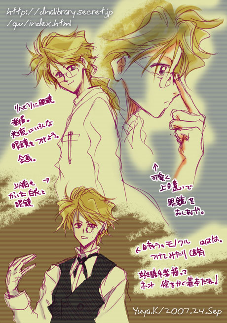 眼鏡光流1<雑文> あるとき知り合いが 「アンケートで聞きたいこと。 それは眼鏡をかけた攻めと眼鏡をかけた受けとどちらがより好きか。(萌えるか)です。」 というわけです。 どちらがより萌えるか。 というのは中々難しいのですけど(私の場合) ケースバイケースだよねぇ?(何もない空間に向かって、同意を求めてみる) 一般的な思考としたどちらかというと多分攻めにかける方が好きなんですけど (特に男×男の場合) 自分が読んで好きだったものとかを考えてみると 全然その限りでは無かったりとかして 根本的にそういうカテゴリ分けみたいなのが 即、萌えに繋がらない方なので 「どちらがより」と言っても、殆ど強制力はないような自分の嗜好。 あまりそういうことは好きになる決定打じゃないというか。 むしろおまけ。 かなりグリコのオマケ。 まぁアンケートに関しては…… この辺あとで消去するかもしれませんけど 友人がSF大会で一度でいいから企画をやりたいというので 素人のお茶会みたいな昔あったようなのやってもいいんじゃないのーみたいなノリで、できれば……何かちょっとした雑談会みたいなのをできたらとか夢を見ている最中なのです。 それで、内容的には、全然まだ煮詰まってないので相手がどこまで話すつもりでいるのか全然わからないんですけど カップリングとかの受け攻め観みたいなのについて ほかの人と一緒に話せたら面白いかなーみたいな感じで…… そのきっかけのためにアンケートしたいとか私が言い出しただけなのですが…… そんなことをやるかもしれないので もし気が向かれましたらアンケートとか御協力いただけたらうれしいです。 というか多分ここにも貼ると思うので。 でも本当にやるのかどうかまだ微妙なところです(笑) 来年のSF大会は大阪で八月の二十五日ぐらいの土日だった気がする…… なんとなく光流は可愛く描きたいみたいな感じで書いているので 眼鏡とか書くと、むしろ鬼畜度が上がるような感じでちょっと恐いというか(苦笑) ちゃらちゃらしてる外見がいいんじゃんねぇー(虚無に向かって同意を求める) 自分で言っててすごくおかしいなぁって思うんですけど 私どちらかというとリアルでは インテリ知的神経質眼鏡が好みのタイプなんですけど もちろんそういうのも物語の中でも好きなんですけど なんかこう…… 光流みたいなタイプというのはちょっと別格に好きなんですよね ちゃらちゃらしてて軽い感じの外見でああ感じのタイプー 流行りものとかにめっちゃ弱そうなー 光流とか馬鹿っぽい遊びとかすごく好きそうだから 保健室とかいったときに、お遊びで一弘の眼鏡とかかけてそうですよ。 当面リハビリ落書きが続くかもしれません。 ゆや/<070924> |