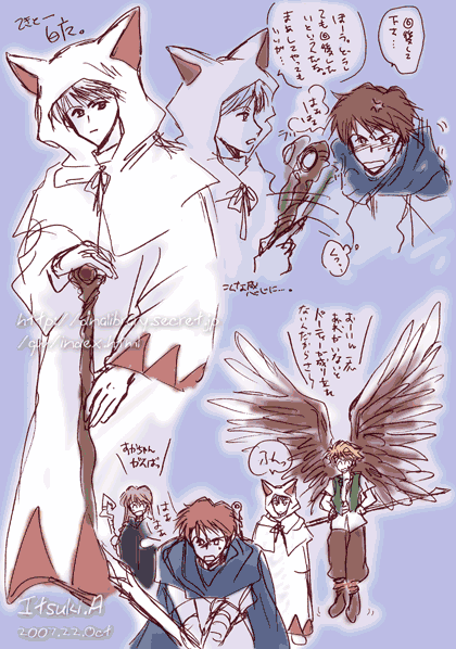 パーティ1「私は忍みたいなキャラクターに白魔導士をやらせたいんだよね。」 と言ったら 「そういうセンスだよね(あなたは)……。」 と半ばあきれられるようにいわれました。 ものすごく偉そうに、嫌いな相手には 瀕死の重傷でも、平服して頼まれないと回復してあげないの。 それが萌えるんじゃないか。 と言うわけで 最初はファイアーエムブレムで考えていたんだけど 途中からはタクティクスオウガもいいなぁとか思っていたら だんだんわけの分からなくなってしまった。 でも白魔導士はFFの……五かな? 猫耳ローブ。 光流は最初、ティバーン(FE〜蒼炎の軌跡)とか思っていたけど だんだんカノープスになったような…… 光流には羽をつけてあげたいのー。 こういうふうにすると ちょっとすか×忍っぽい。 ゆや/<071023> |