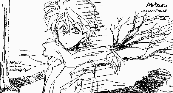 ■2005年11月11日(金) ひとりえちゃ絵その2 普通の光流。 寒そうな夕方に空を見上げて白い息を吐く。 |