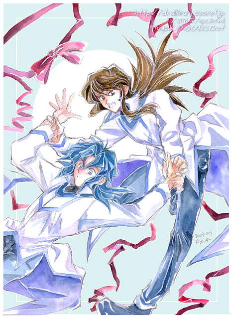 Gift「Gift」表紙イラスト別バージョン。 何か修羅場明けに見たら、線の飛ばし具合失敗していたので もう一度スキャナーから読み込んでみた。 ついでにせっかくだから同じだとつまらないので 背景に使っていた色を変えたバージョン。 なんとなくさわやかー。 可愛い感じの話にしたいから、可愛い表紙にしようとかそんな感じで。 吹雪に振り回される亮君って感じがお気に入りー。 ゆや/<091013> |