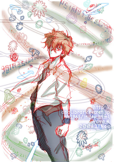 千昭3オフラインでやっぱり漫画にしようかなあと悩みながら 浮かんだネタのイメージイラスト。 こんな感じでー。 だんだん貞本絵から離れて オリジナルの絵になってきたような。 背景を適当に記憶に残っていたデジモンの インターネットのイメージ背景のつもり……つもりだけ。 こういう印象が残っているというような。 千昭はこういう変にビビットな主線がよく似合うなあー(笑) ゆや/<061117> |