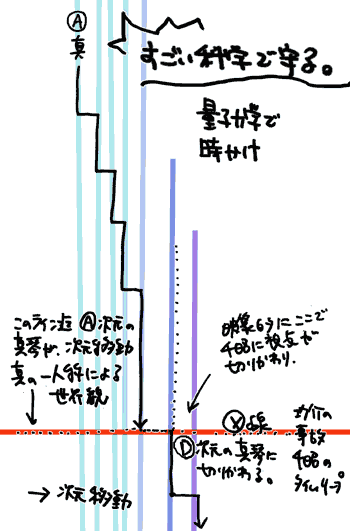 | (↑上図参照) 違和感の原因はおそらく 視点の切り換え。 それまで真琴Aの視点でずっと話が進められていて 量子力学的に言うなら 一番最初の真琴が話していた千昭Aは ずっと平行世界Aに残ったまま 真琴が平行世界Aを離れた時点で もう物語にでてこないことになって進みます。 ところが功介が美幸ちゃんと踏切に突っ込む瞬間 この瞬間をラインXとすると ここを境に 見ている側は真琴Aの視点から 急激に千昭C(と仮定する)の視点へと 切り換えさせられる。 そして千昭Cがタイムリープしたために いつの間にか真琴Aは真琴Dに入れ替わる。 ここでタイムリープしたのは もうすでにチャージの回数がゼロになっている真琴Aではなく チャージの回数が1の千昭C。 厳密には色々ややこしいですが 真琴Aの記憶を持った真琴Dに入れ替わり 真琴Dがチャージの回数が残っているというのは 量子力学ではなんとか可能な感じがします。 記憶に関しては、千昭が時間を止めたために 真琴Aと真琴Dの記憶が入り交じったとか(笑) チャージの方はもっと簡単で 割と下らないことに使っていたタイムリープのうち 真琴Dの方が一回少なく使っていたわけです(笑) 真琴Dの方が真琴Aよりほんの少し要領がいいとかね。 そのわずかな違いが違和感となって 残るわけですね(笑) こうやって書くと 案外使えるな!! 量子力学!! 当たり前ですが結構適当です。 理解できない方は忘れてください……。 量子力学って何? という方で気になる方は ご自分でお調べください。 ……誰が読むんだこの文章…… <ゆや/20060907 > 終わり。 |